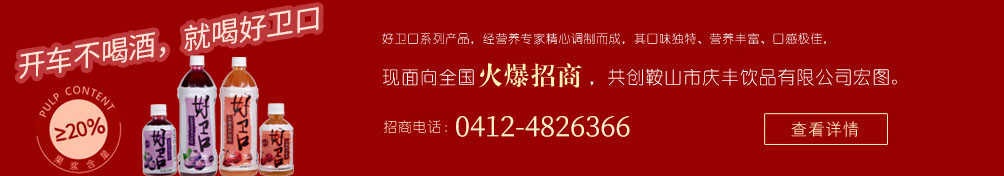 鞍山市慶豐飲品有限公司始建于1992年,是專業(yè)從事山楂汁飲料研發(fā)、生產(chǎn)及銷售的產(chǎn)銷一體化大型民營企業(yè)。 工廠位于遼寧中部的遼河三角洲腹地,地處環(huán)渤海經(jīng)濟區(qū)圈鞍山市臺安工業(yè)園區(qū)內(nèi)(京沈高速公路臺安出口西200米處),擁有占地面積23000多平方米的花園式飲料生產(chǎn)基地,公司資金實力雄厚,引進多條國內(nèi)外先進的飲料自動化生產(chǎn)線,擁有高級技術(shù)人才及生產(chǎn)工人近百名,是東北地區(qū)專業(yè)山楂汁研發(fā)生產(chǎn)型企業(yè),主要生產(chǎn)“好衛(wèi)口”山楂汁系列,及“好衛(wèi)口”橙汁系列,藍(lán)莓汁系列,蘋果醋系列,4大系列飲品近二十余種的果汁飲料